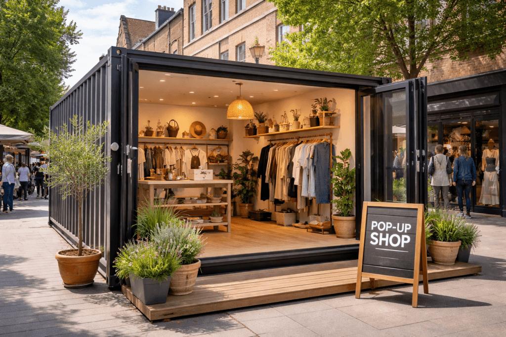 A UK independent clothing brand used a 20ft container as a summer pop-up in a coastal town. The container was installed in one day, branded externally, and later relocated to a Christmas market — generating sales in two locations with one asset.